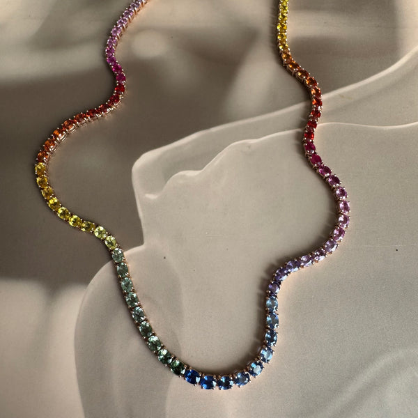 This necklace features 22.77 cts of Multicolor Sapphires and 1.03 cts of Ruby in 14 kt Rose Gold.